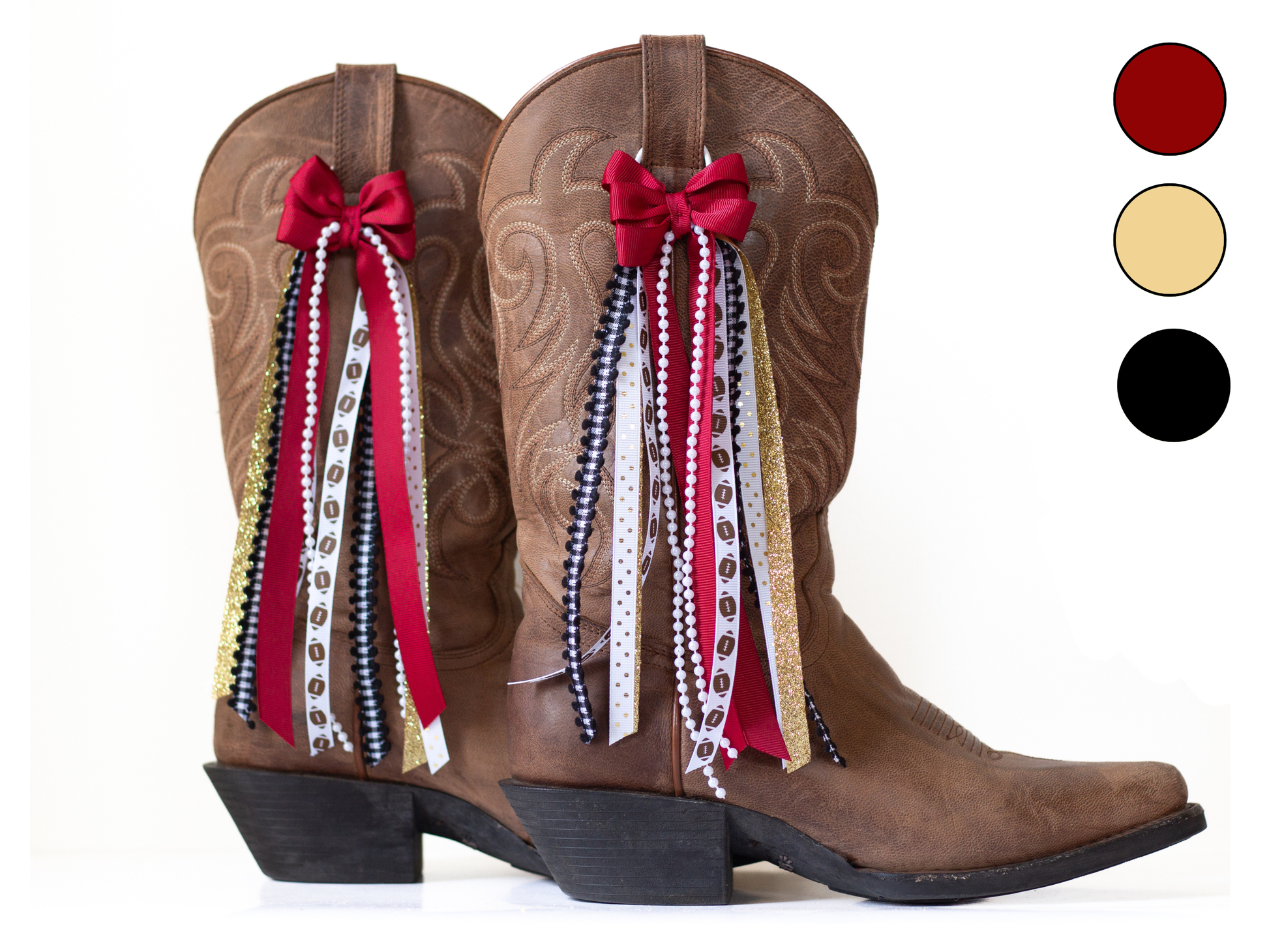 This FanPack includes two pairs of boot bows in garnet and gold. One pair features garnet as the main color, and the other reverses the look so you can switch up your style.