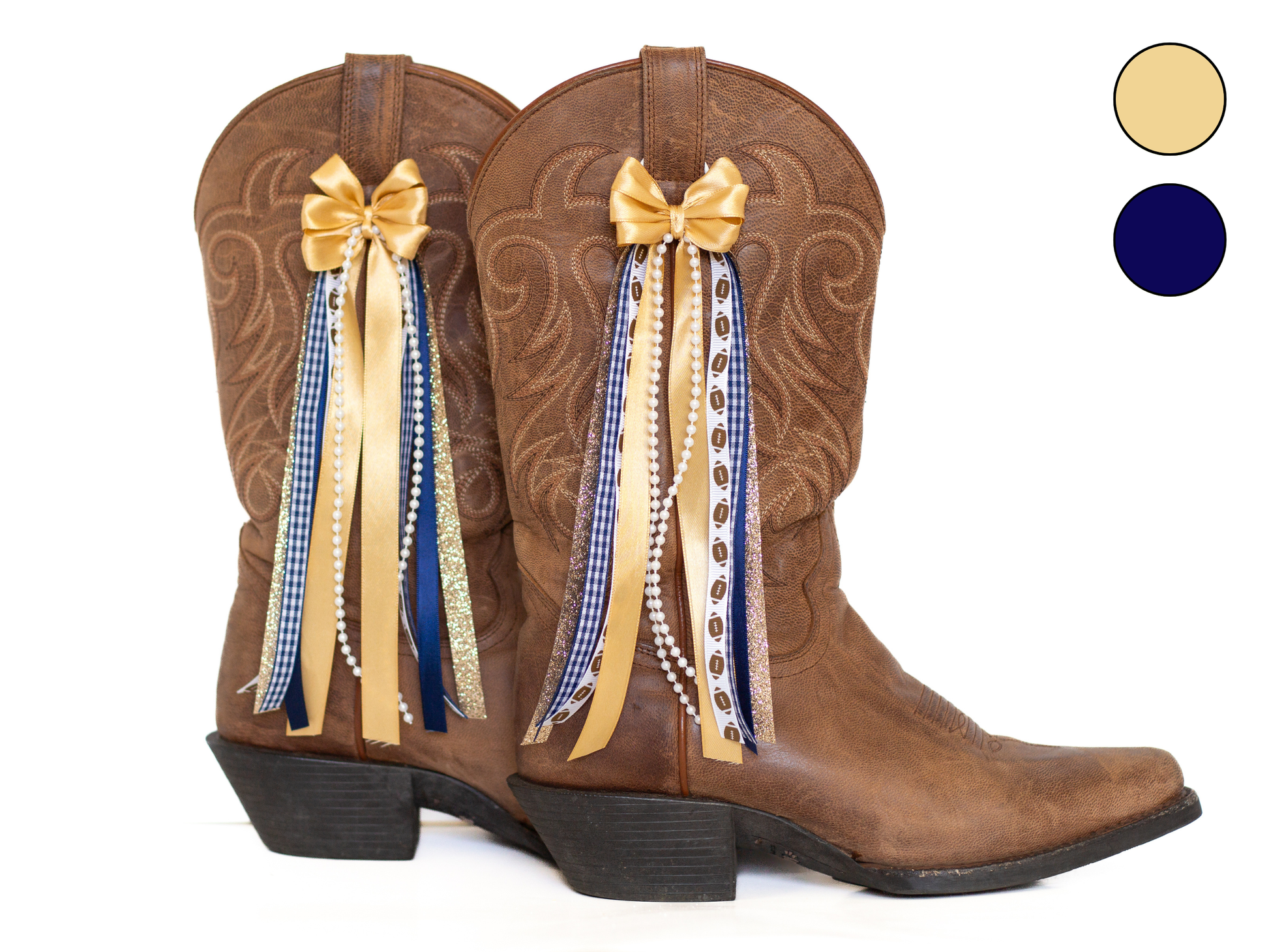 This FanPack includes two pairs of boot bows in navy and gold. One pair features navy as the main color, and the other reverses the look so you can switch up your style.